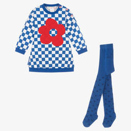 The girls blue heart jersey dress set by Agatha Ruiz de la Prada features charming colorful heart patterns. Crafted from a soft cotton blend jersey with a cozy fleecy lining, the long-sleeved dress includes a delightful ruffle hem and convenient popper fastenings at the back. Paired with matching blue cotton tights featuring heart motifs, this set is lovely for adding a playful touch to any occasion. Limited quantities available, so don't miss out.