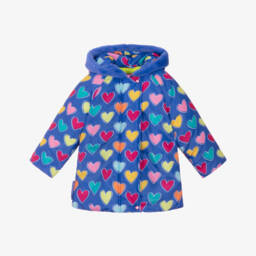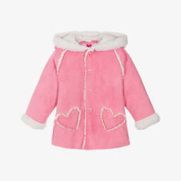 A gorgeous bright pink hooded coat for girls by Agatha Ruiz de la Prada, patterned in the brand's signature love-hearts. Silky smooth, it is softly padded for warmth and has a cosy polar fleece lining. There are plush faux fur trims on the cuffs and hem for a stylish look, with internal ribbed cuffs to keep out chilly winds. It fastens with a chunky zip down the front and has concealed side seam pockets for carrying small essentials.