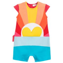 Super cute red shortie for baby girls by Agatha Ruiz de la Prada. Made in comfortable cotton jersey, it is patterned with orange and green carrots. It has orange shoulder straps with fixed bows and the brand's logo tab sewn on the chest.