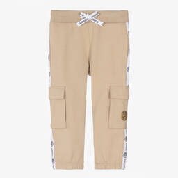 Comfortable navy blue joggers for baby boys by AIGNER, with cargo-style patch pockets and concealed side pockets. Made in soft cotton jersey, they have white and navy blue logo tape trim on the sides and an elasticated waist with a branded drawstring tie for an adjustable fit. To complete the look, there is a shiny gold signature 'A' logo patch on one pocket.