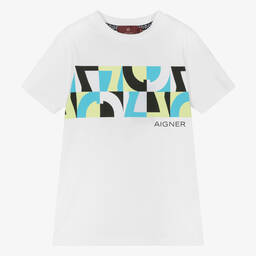 Navy blue T-shirt for baby girls by AIGNER, made in soft and comfortable cotton jersey. It has a red and gold logo print on the chest and a branded tab on the side seam. Casual yet stylish, it has capped sleeves and a keyhole button fastening on the back.