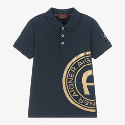 The boys blue and black polo top by AIGNER is crafted from soft cotton jersey, featuring a striking colourblock design. With the iconic 'A' horseshoe logo and bold white branding, it offers a stylish look for any occasion. The short sleeves and branded button fastenings provide comfort and ease of wear. Limited quantities available for this elegant piece, suitable for young trendsetters.