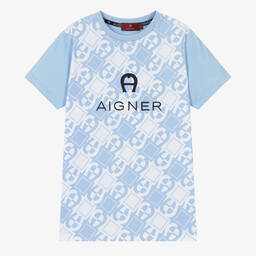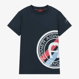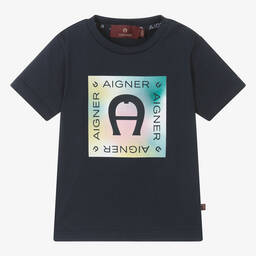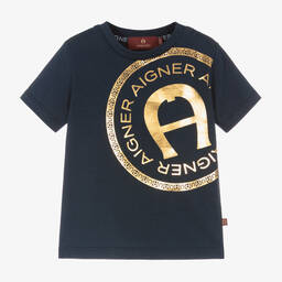 Boys navy blue logo T-shirt by AIGNER, made from soft cotton jersey. This stylish piece features the designer's signature 'A' horseshoe logo with a striking metallic gold circular print on the front. Perfect for casual wear, it offers comfort and a trendy look for everyday activities. Limited quantities available, so it's your last chance to buy this exclusive item.