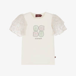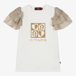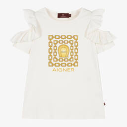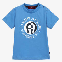 A white T-shirt for little boys by AIGNER, made from super soft cotton jersey. The front is patterned in a blue gradient logo design, with the brand's signature 'A' horseshoe logo embroidered in black. There are useful popper fastenings on one shoulder, ensuring the top pulls easily over the head.