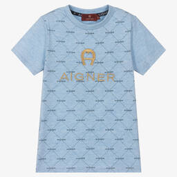 Logo inspired, white T-shirt for boys by AIGNER. The front has the brand's signature 'A' horseshoe logo embroidered in gold, over a diamond patterned navy blue logo print. Casual and comfortable, it is made from soft and stretchy cotton jersey with a crew neck.