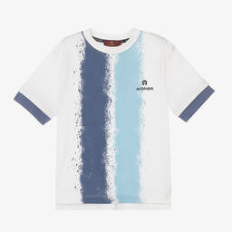 White and orange t-shirt for boys by German designer AIGNER. Made from soft and stretchy jersey cotton, this breathable top features yellow and orange vertical painted stripes, complemented by the brands signature 'A' horseshoe logo print. It has orange layered sleeves and split hem on the sides, ensuring movement and comfort.