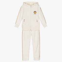 A beige tracksuit for girls by AIGNER, made from soft and lightweight cotton jersey. The hooded zip-up top has a glittery gold handbag motif on the chest, with logo taped sleeves for added casual glam. The brand's signature 'A' horseshoe logo is subtly featured on the zip-up pockets. This logo is decorated in diamanté's on the matching trousers, which are comfortably finished with an elasticated waist.
