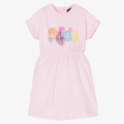 Pale green dress for little girls by German brand AIGNER, made in soft cotton jersey. Comfortable and easy to wear, it has an elasticated waist, turn-up cuffs and easy popper fastenings on the back. The dress is finished with a colourful pastel motif and white logo print on the front.