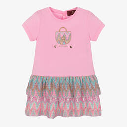 The girls green cotton lace dress by AIGNER features a soft, stretchy cotton jersey bodice with an embroidered handbag appliqué, showcasing the signature 'A' horseshoe logo in gold and two golden heart charms. Its tiered skirt is crafted from fine knitted lace in green and beige with shimmery gold thread. Popper fastenings at the back ensure easy dressing. Limited quantities available, so don't miss this last chance to buy.