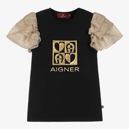 Girls ivory gold ruffle top by AIGNER, featuring elegant gold plissé sleeves for a touch of glamour. Crafted from soft and stretchy jersey, it ensures a comfortable fit and showcases a signature 'A' horseshoe metallic gold motif on the chest. Perfect for stylish spring and summer outings. Limited quantities available – last chance to buy.