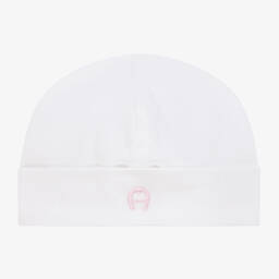 Sweet ivory layette hat for baby boys and girls by AIGNER. Made in beautifully soft Pima cotton jersey, it is ideal for keeping little heads warm. The turned-up brim has a dark beige branded trim and a gold heart logo print.
