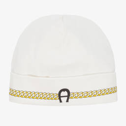 Pale pink hat for baby girls by AIGNER, made in super soft Pima cotton jersey. The brim has a gold chain print, with the brand's signature 'A' horseshoe logo in black.