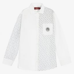 The teen boys white and beige logo shirt by AIGNER features a repeat diagonal logo print in beige for a distinct look. This smart shirt includes the iconic 'A' horseshoe logo embroidered on the chest pocket in gold, enhancing its designer appeal. Made from lightweight cotton poplin, it has long sleeves, a pointed collar, and branded button fastenings. Last chance to buy with limited quantities available.