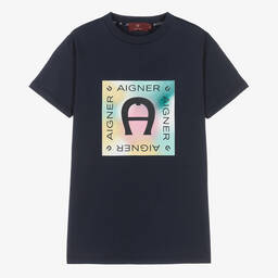 Teen boys white cotton T-shirt by AIGNER features a signature 'A' horseshoe logo in a vibrant pink, yellow, and green square on the chest. Made from soft and comfortable cotton jersey, this short-sleeved T-shirt is perfect for casual wear. Limited quantities available, so don't miss this last chance to buy this stylish and practical addition to any teen's wardrobe.