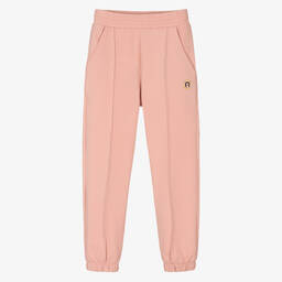 Beige cotton joggers for teen girls by German label AIGNER, with front seam detailing. The brand's distinctive 'A' horseshoe logo is printed on the front in black and gold. These comfortable cuffed joggers are made in soft and stretchy cotton sweatshirt jersey, with an elasticated waistband and convenient front pockets.