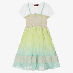 Lovely orange and pink ombré dress and T-shirt set for teen girls by AIGNER, for a stylish, casual look. The silky, cotton-blend, tiered dress has a ruched bodice with adjustable shoulder straps and a white cotton voile lining for comfort. The brand's signature 'A' horseshoe logo is embroidered in pink by the hemline. It comes with a white cotton jersey T-shirt that has pink and orange, watercolour-inspired circles printed on the front with a pink logo. The two pieces can be worn together or separately.