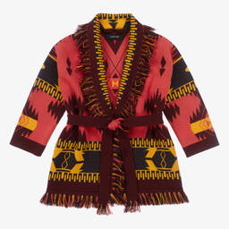 Boys blue icon jacquard cardigan by Alanui is a signature piece handcrafted in a double jacquard knit from the finest virgin wool. Made in Italy, it features the iconic Alanui pattern with a shawl collar and multicoloured fringed trims. Combining style with luxurious comfort, it can be worn with an open front or with a two-tone tie belt around the waist. Last chance to buy, limited quantities available.