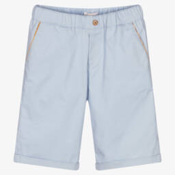 Lightweight linen and cotton blend shorts for boys by Alviero Martini. Patterned with the brand's iconic Geo map print in white, these smart-casual shorts have two slanted front pockets, a small back pocket and fasten with both a button and zip on the front. The signature 1a Classe logo is embossed on the button fastening. They have a concealed adjustable waistband for a comfortable fit.