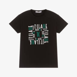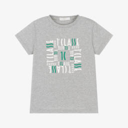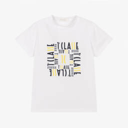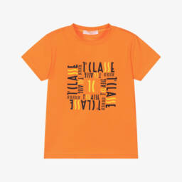 Bright orange T-shirt for boys by Italian label Alviero Martini, made in soft cotton jersey. For instant designer appeal, it features a striking 1a Classe logo pattern in contrasting yellow and navy blue.