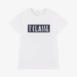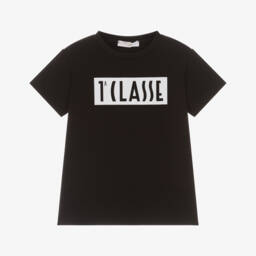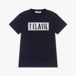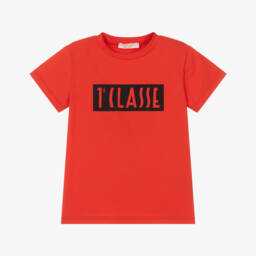 Red cotton T-shirt for boys by Alviero Martini, with an eye-catching, navy blue 1a Classe box logo print. This casual tee has a classic crew neckline and short sleeves, and is made in soft jersey for comfortable wear.