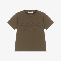 Yellow cotton crew neck T-shirt for boys by Italian brand Alviero Martini. Made from a soft and stretchy jersey, for optimal comfort, this statement piece features a raised dark blue, repeated 1a Classe logo pattern print. The brand's iconic dark beige Geo map design can be found on the turned-up sleeve cuffs and on the side seam tab detail.