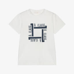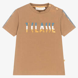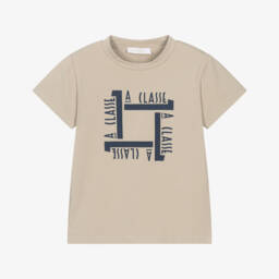 Boys navy blue T-shirt by Italian designer Alviero Martini, made in soft cotton jersey. It has the brand's 1a Classe logo on the front in blue, yellow and dark beige Geo map print, with matching trim on the sleeves.