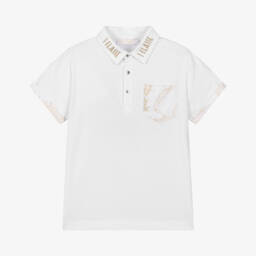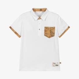 Teen boys black geo map polo shirt by Alviero Martini, featuring a colourblock style with a dark beige panel showcasing the distinctive Geo Map print and a white chest panel adorned with a black 1a Classe logo motif. Crafted from soft cotton jersey, it includes a pointed collar and branded silver popper fastenings. Limited quantities available, make this stylish piece part of your wardrobe while stocks last.