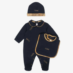 The boys geo map collar babysuit set by Alviero Martini is a delightful addition to any wardrobe. Crafted in a soft woven cotton blend, it features an elegant map-patterned collar and cuffs, adding a touch of sophistication. The set includes a matching hat and bib, perfectly coordinated for a seamless look. The babysuit offers easy snap closures for quick dressing and changing, ensuring comfort and convenience. Limited quantities available; secure this charming ensemble today.