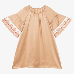 Beautiful pale blue nightdress for girls by AMIKI Children, made in luxurious silk. Soft and lightweight, it has a gently elasticated neckline with a satin bow detail and lovely flared sleeves with delicate white embroidered tulle trim.