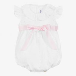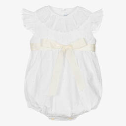 An adorable white shortie for baby boys and girls by Ancar, made in lightweight cotton broderie anglaise and fully lined. With frilled sleeves and collar, it is finished with a pale blue grosgrain ribbon and bow. There are button fastenings on the back and between the legs.