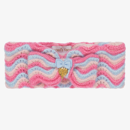 Super soft, pale pink, beige and soft yellow headband for girls by British brand Angel's Face, knitted with a zigzag pattern. Double-sided, it has a fixed, knitted bow on the front, with the designer's signature golden heart charm and grosgrain bow.