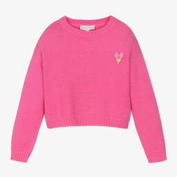 Eye-catching black sweater for girls by British brand Angel's Face, with sparkling, iridescent diamanté angel wings on the back. Made in a warm, super soft, knitted viscose blend, it has the designer's signature golden heart charm and grosgrain bow on one side, with cosy ribbed trims.