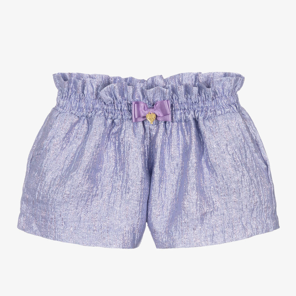 Girls lilac jacquard shorts by Angel's Face, made in crinkled look jacquard with metallic detailing for added sparkle. Featuring flared legs and a ruffled, paper bag style elasticated waistband, they are fully lined in cotton voile for comfort. Limited quantities available, these shorts are perfect for smart casual occasions and come with the brand's signature gold heart charm and bow stitched on the front.