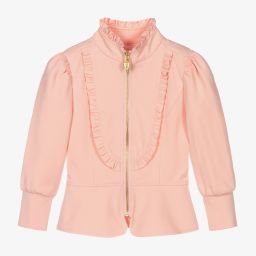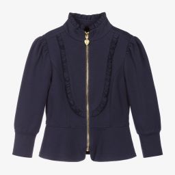 Girls navy blue jacket from Angel's Face, made in soft Milano jersey. It has a gold zip fastening with the signature gold heart charm on the zip pull. Stretchy and lightweight, it has puffed shoulders and lovely ruffle trims.