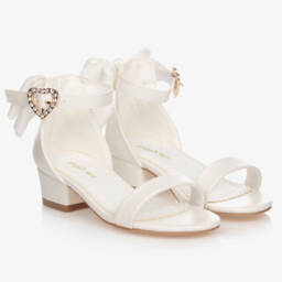 Girls special occasion sandals by Angel's Face, in pearlised navy blue faux leather with 3.5 cm-high heels. Fastening with sparkly diamanté, heart-shaped buckle on the ankle strap, they have pretty grosgrain bows on the back.