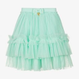 Girls orange skirt from Angel's Face, made in tiered layers of pleated tulle. It has ruffle trims and a super-soft cotton and modal blend jersey lining. The signature gold heart charm and grosgrain bow is sewn onto the front of the elasticated waistband.