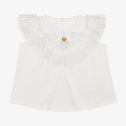 Girls pink cotton tulle top by Angel's Face is a charming addition with its delightful design. Crafted from soft cotton jersey, it features lovely tulle ruffles across the front and back, complemented by a sheer neckline with the signature grosgrain bow and a golden angel wings charm. The elegant keyhole button fastening on the back adds sophistication. Perfect for spring and summer, this top is ideal for special occasions and everyday wear. Limited quantities available, last chance to buy.