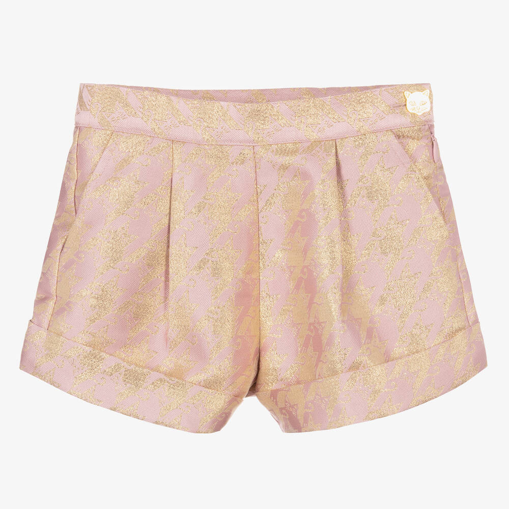 Sparkling with a gold houndstooth pattern, these rose pink jacquard shorts for girls are by British brand Angel's Face. Lovely for casualwear or for a special occasion, this eye-catching design is pleated on the front and has elegant turn-up hems. Lined in luxurious crêpe chiffon, they fasten with a concealed side zip and a gold cat-shaped button, with an adjustable for an ideal fit.