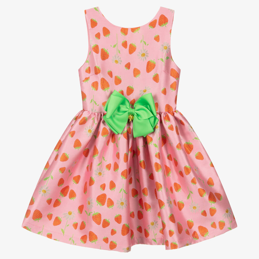 Girls classic fit and flare dress in pink jacquard by Angel's Face. With a shimmery sheen, the fabric has a lovely strawberry and daisy design. There is a large green grosgrain bow at the waist, embellished with a signature gold angel wing charm, giving way to a flared and gathered skirt. On the back is an exposed metal zip with gold heart wing charm pull.