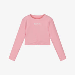 Black sports top for girls by Bonini, made in a silky and stretchy fabric. This long-sleeved top has a white logo print on the front and is cropped with a stylish ruched detail. Soft and comfortable, it is ideal for both casual wear and sports activities.