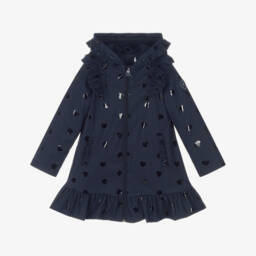 Girls red raincoat by A Dee, featuring a delightful pattern of shiny hearts. This charming coat is designed with playful ruffles on the hood and hem, and pretty bows on the pockets. It has a soft fleece lining for extra warmth and a full zip fastening for easy wear.