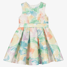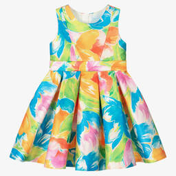 So lovely for girls, this gorgeous satin dress is by Abel & Lula. It is decorated with turquoise blue, orange, pink and green floral motifs for a truly feminine look. The panelled bodice and box-pleated skirt make for an elegant silhouette, and the cotton voile lining ensures comfortable wear. A removable popper-fastening sash with a decorative bow completes this stunning design.