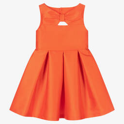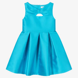 So lovely for girls, this turquoise blue satin dress is by Abel & Lula. The bodice is shaped in a pretty bow across the shoulders, with a small cut-out detail on the front and an open back design. Feminine box pleats on the skirt add timeless elegance. This easy-to-wear dress has a comfortable cotton lining, with buttons and a concealed zip on the back for a seamless look.