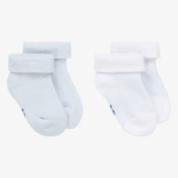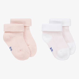 Two pairs of white socks for baby boys and girls by Absorba, made in a soft and stretchy cotton blend. One pair is plain white and the other pair has a delicate beige and white striped pattern with white trims. Both pairs have an embroidered red heart on the cuffs and warm, cosy towelling on the inside.