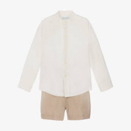 The green and ivory stripe short set is perfect for boys by Abuela Tata, featuring a stylish collarless shirt with pearlescent buttons and matching striped trim. The lightweight fabric offers a linen-like feel, ideal for warmer days. The shorts, designed with comfort in mind, include a button and zip fastening and an adjustable waist. Limited quantities available, making this a last chance to buy this charming outfit.