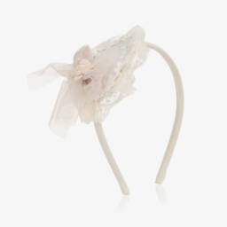 A charming ivory and blue floral headband for girls by Abuela Tata offers a delightful touch to any outfit. The headband features a flexible band covered in gentle fabric, adorned with a mint blue rosette for a classic appeal. Decorated with a tulle bow and lace trim, it includes sweet fabric daisies around the edge. Perfect for special occasions or everyday wear, limited quantities available for this elegant accessory.
