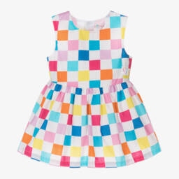 Girls white dress by Agatha Ruiz de la Prada, made in lightweight cotton poplin. It has a square neckline and yellow pom-pom trim on the bodice and flutter sleeves. There is a colourful street scene print around the hem with glittery yellow detail and embroidered yellow stitching.