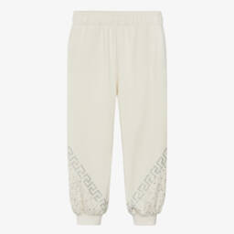 Girls white joggers for girls by Agatha Ruiz de la Prada, made in a comfortable sweatshirt jersey. They are patterned with the brand's fun, multicoloured logo with co-ordinated fuchsia pink piping down the legs. Lightweight, they have concealed front pockets with a stretchy elasticated waistband and ribbed cuffs for a comfortable fit.