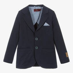 Boys pale grey cotton blazer by AIGNER is designed for optimum comfort and style. Made from super-soft and stretchy cotton jersey, it features a vent detail at the back and a structured fit. The blazer is accented with a white, grey, and black patterned trim, signature 'A' horseshoe branding, and a gold logo label on the sleeve. It fastens with blue buttons and includes a removable pocket square for coordinated looks. Limited quantities available.