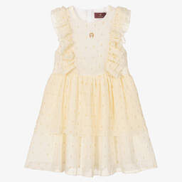Gorgeous pale pink dress for girls by AIGNER, with frills over the shoulders. Made in lightweight chiffon shimmering with gold and silver plumetis, it has the brand's signature 'A' horseshoe logo embroidered in gold on the bodice. Lined in cotton voile for comfort, it has a tiered skirt and fastens on the back with a neat, concealed zip.